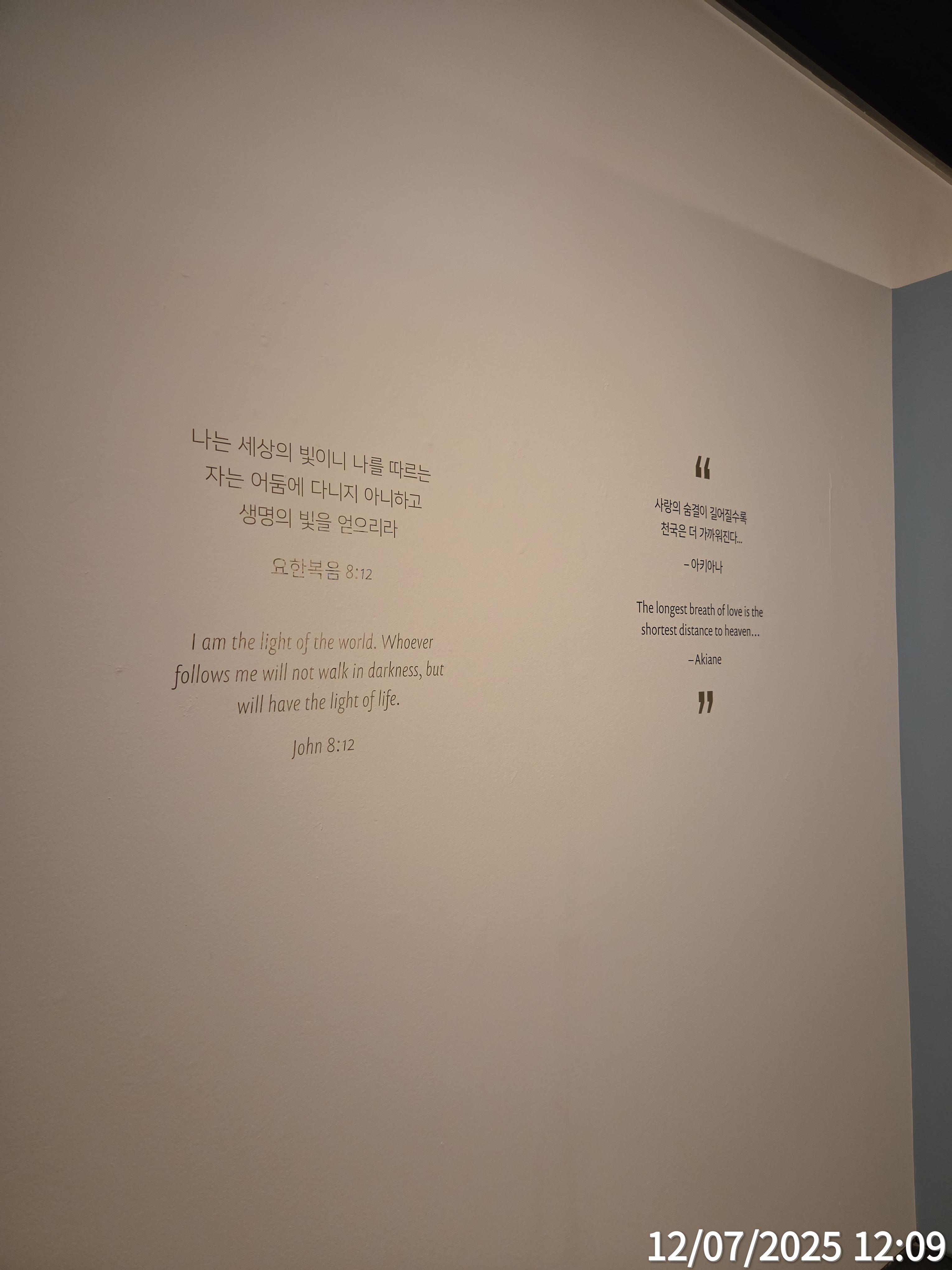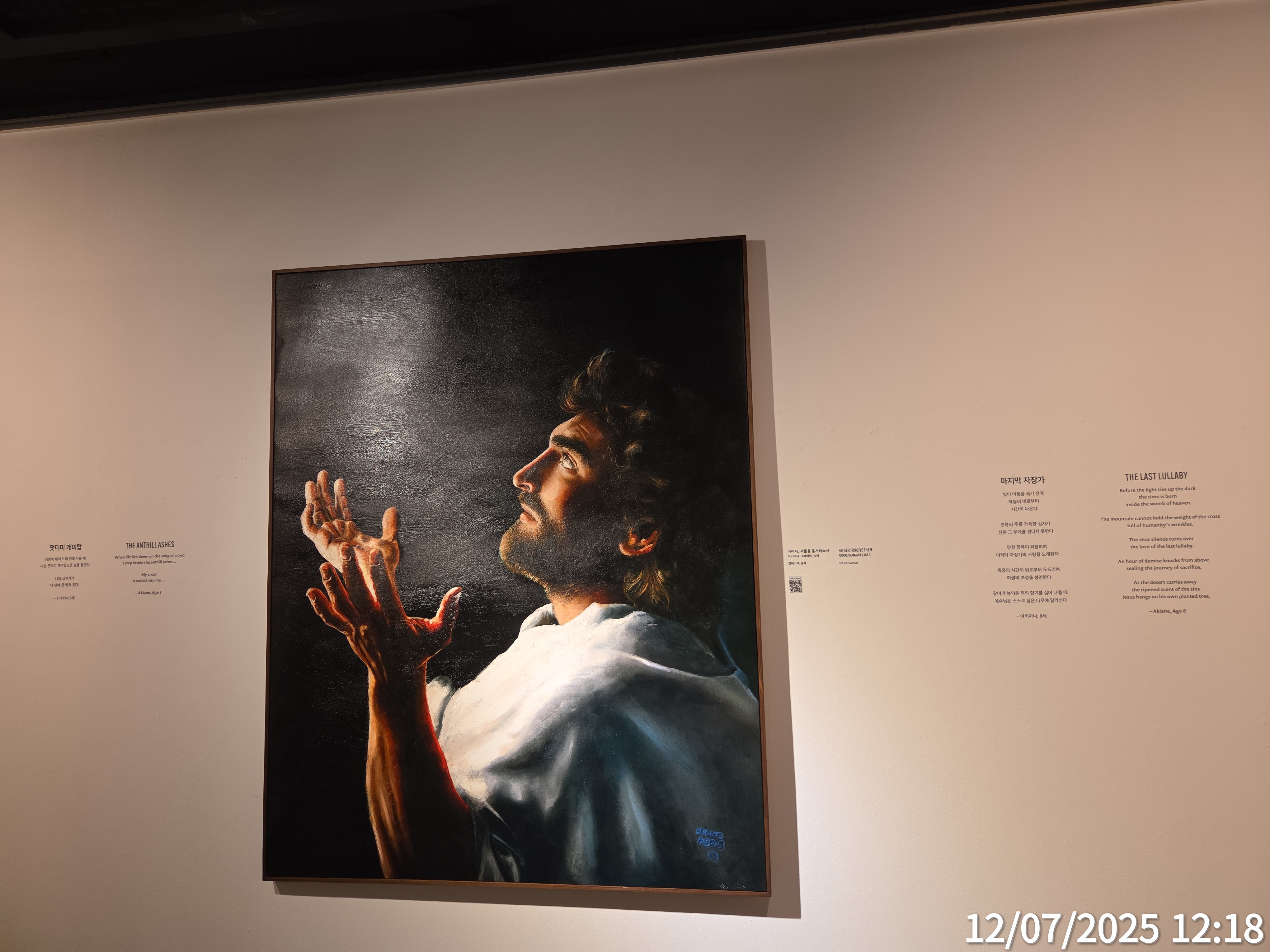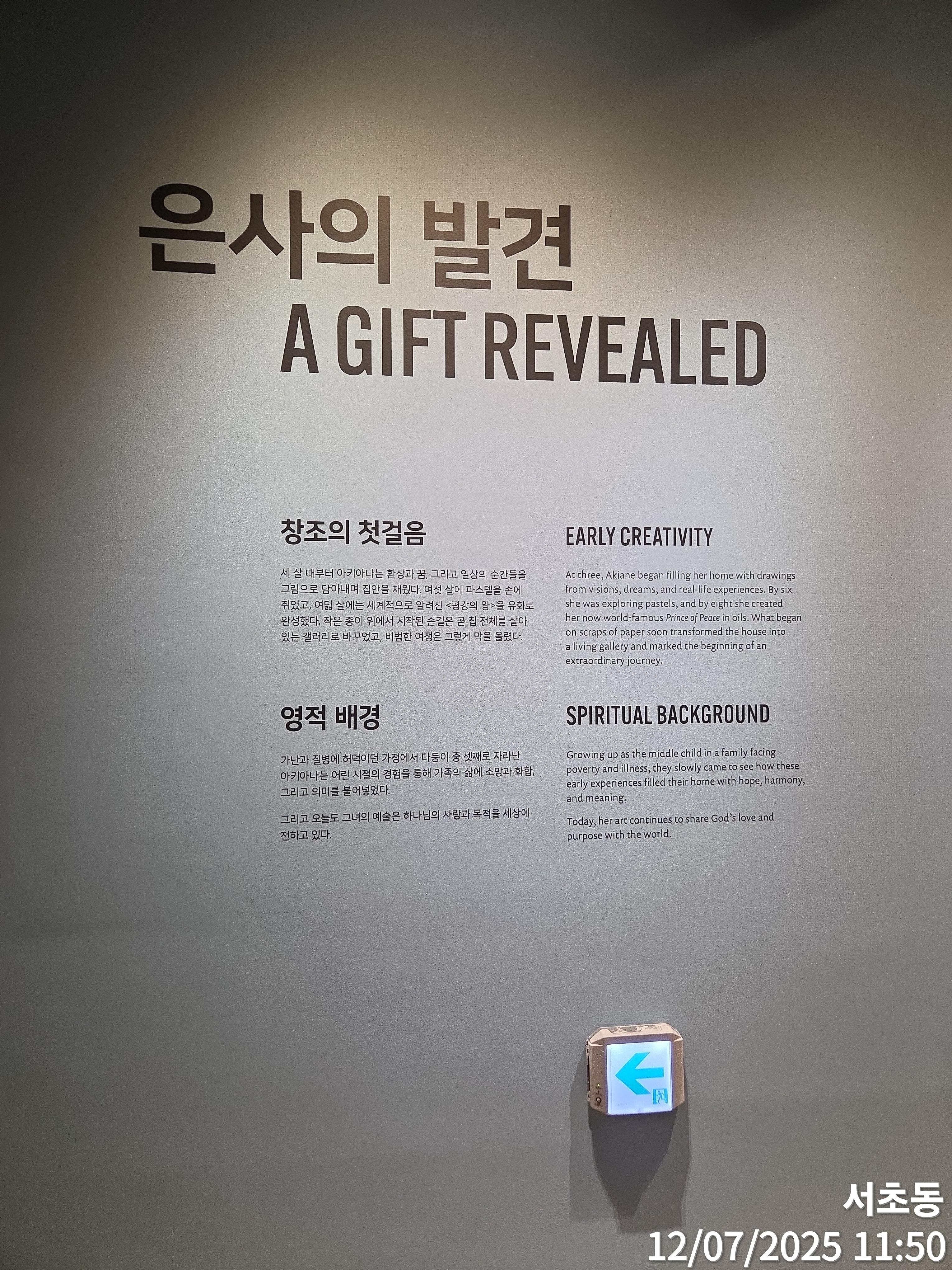 -어제 교회에서 아키아나 크래메릭의 작품을 관람했습니다. 어릴 때부터 하나님을 본 것을 그림으로 표현했다는 이야기를 알고 있었기에, 작품 앞에 서는 순간부터 묘한 울림이 느껴졌습니다. 특히 눈빛을 묘사한 방식은 현실을 넘어 영적인 깊이를 전달해주는 듯했고, 인물의 얼굴에서 말로 설명할 수 없는 평안과 위엄이 전해졌습니다. 그림을 보고 있는 동안, 제 안의 불안과 복잡한 감정들이 잠시 멈추고, 오랜만에 ‘쉼’을 경험했습니다. 또한 예배 후 감상이라 더욱 은혜와 감동이 몰려왔고, 자녀 같은 느낌도 들어서 참으로 이 세상에는 자랑스런 자녀들이 많다는 것을 더욱 깨닫게 되었습니다. 영상으로 작품을 설명도 해주고 있어 쉽게 이해가 되는 전시였고, 주님을 깊이 묵상하며 그리는 그림으로 여겨져서 더욱 마음에 와 닿는 작품이라 하나 하나 깊이 있게 감상해 보았으며, 이렇게 좋은 그림을 감상할 수 있는 것도 하나님의 은혜라는 생각이 들었습니다.